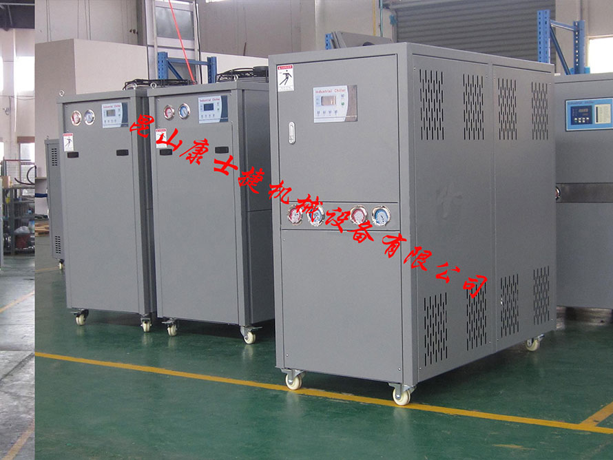 目前工廠使用較多的便是注塑機,塑膠粒經(jīng)加熱溶化后注入模具中,凝結(jié)后,開模頂出成型塑膠工件,在連續(xù)生產(chǎn)過程中有需用對模具進行冷卻,以縮短塑膠凝結(jié)時間,提高工件尺寸精度,成型質(zhì)量、表面質(zhì)量。而在早期,很多用戶選用冷卻水塔為其降溫,這種冷卻方式只適合在環(huán)境溫度較低的情況下達到降溫目的,一旦環(huán)境溫度升高,則無法保證產(chǎn)品精度。因此,就需要使用到冷水機