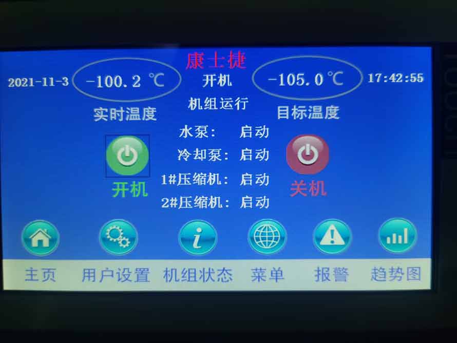 康士捷生產(chǎn)的-100度超低溫制冷機組 復疊式冷凍機組設(shè)計多重保護,確保機組運行穩(wěn)定。