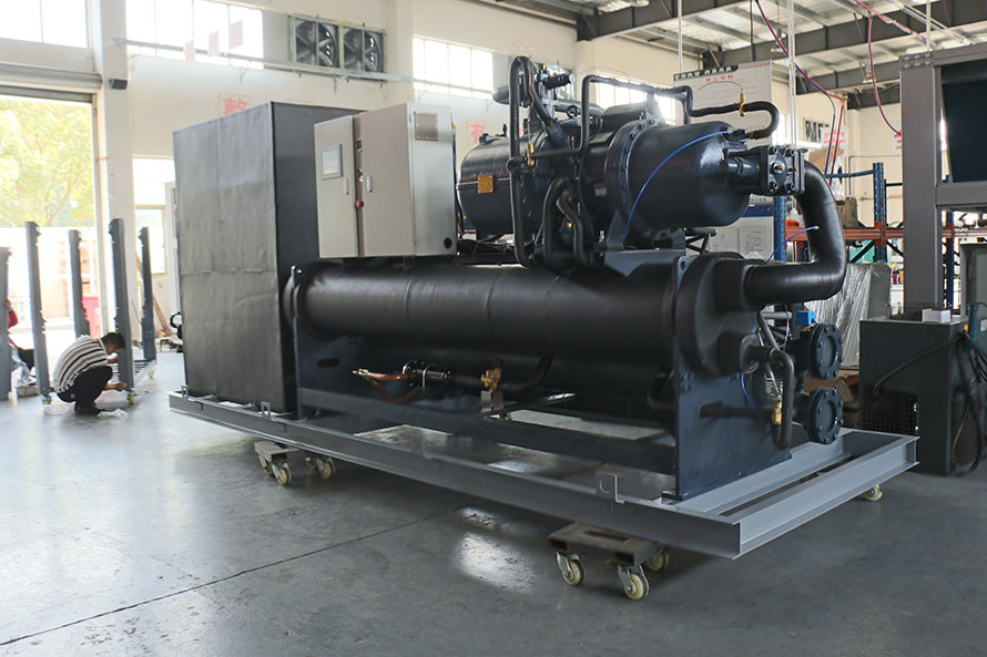 2、水冷式螺桿式工業(yè)冷凍機(jī)組,通過冷卻塔以冷卻循環(huán)水為冷凝方式的控溫設(shè)備;